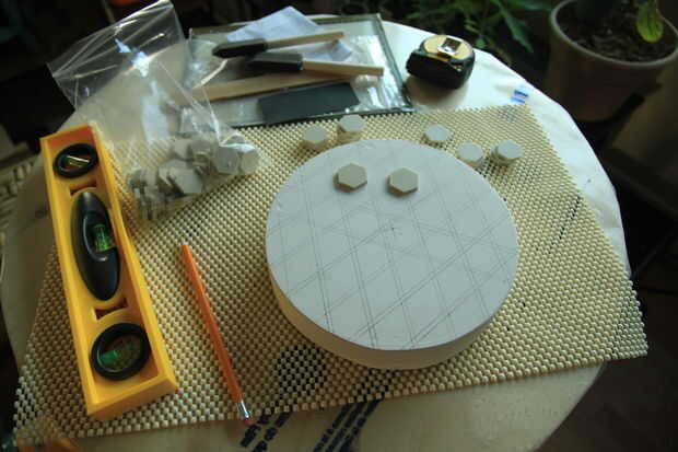 Pegar los azulejos sobre la herramienta de yeso con resina. Utilicé un epoxy gel rápido pero no lo recomendaría ya que fue erosionando lentamente con el tiempo.
