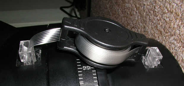 Este es el cable de red recto retráctil, que he comprado fuera de eBay para $1. Es muy ligero y se retrae/amplía automáticamente en respuesta al movimiento de RA del ámbito: