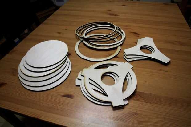 Como no estoy siguiendo ningún plan, que tenía que hacer una Asamblea preliminar para validar el diseño. Comencé cortando los deflectores de contrachapado de abedul de 1/4". Usé un cortador láser porque pensé que no sería capaz de cortar una pieza delgada que con una sierra de calar sin romperlo.