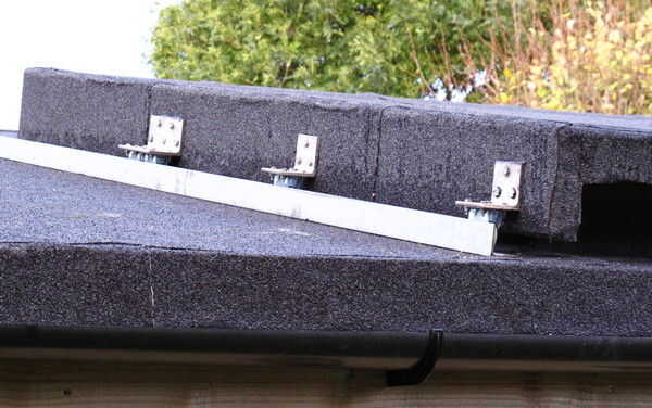 Me decidí por usar (una vez más) hierro de ángulo aunque esta vez fue para acero galvanizado en vez de la inviable inoxidable. Para que dos longitudes se cortaron en lo que quedaba de mi chop vio y atornillado al techo con un montón de sellador pegajoso desagradable de dejar los orificios de fugas de agua.