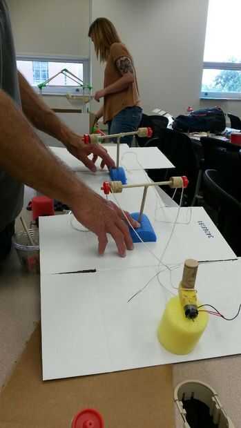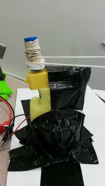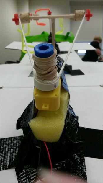 Utilizar un motorreductor con un archivo adjunto de extensión, hemos elevado al mismo nivel y ángulo como los postes del telesilla. Incluso con la elevación y el ángulo, la línea se deslizó fuera el motor accesorio. Bandas de goma fueron estiradas a lo largo de la extensión para crear la fricción estática necesaria para mover la línea a lo largo. Una vez había suficiente fricción, la línea fue encordada y estábamos en el negocio.