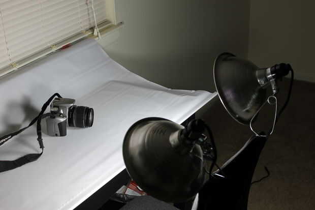 Desde el comienzo de este proyecto, me mudé a un apartamento. Lamentablemente, no tengo un garaje en, y no he encontrado un lugar permanente para montar mi telón de fondo. Aquí es cómo he resuelto el problema; Mis persianas son un peso lo suficientemente pesado para sostener la parte superior de mi telón de fondo, y una silla tiene mis luces. No hay necesidad de instalar permanentemente cualquier hardware. Si se necesita más luz sobre el objeto, usar una lámpara al lado de mi escritorio.