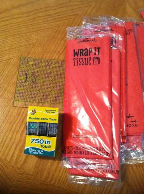 También necesita un 4 x 4 o regla cuadrada 6 x 6. Pañuelo de papel (yo usé unos 24 paquetes)