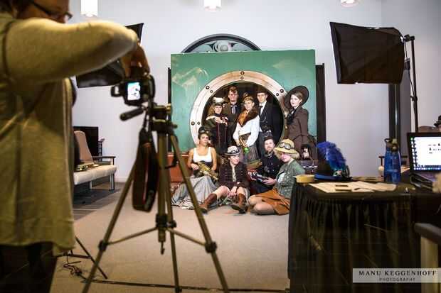 No puede haber un baile de disfraces sin una cabina de fotos, así que sabíamos que necesitábamos hacer una proposición interesante para el telón de fondo de la foto. Decidimos hacer un ojo de buey grande, como se puede ver en Nautilus de Jules Verne o un dirigible de steampunk.