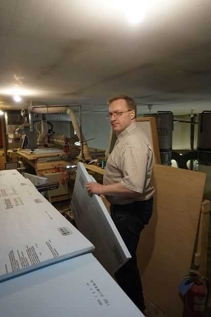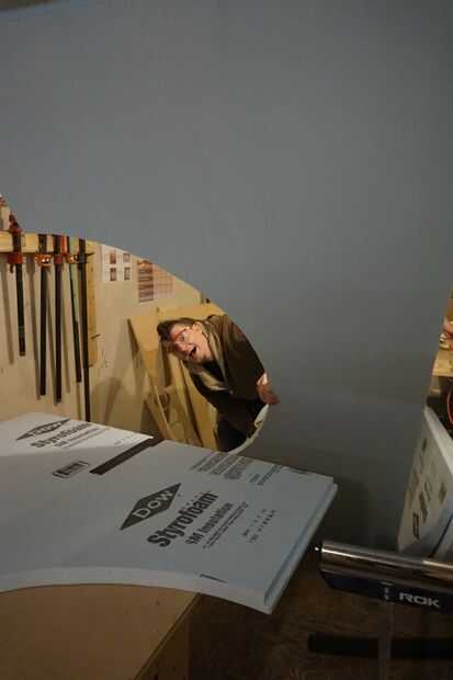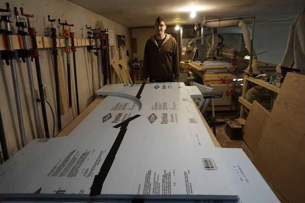 Decidimos construir el telón de fondo de espuma de aislamiento de hojas azules. Originalmente íbamos a cortar todas las piezas con un router CNC, puesto que era bastante simples todas las formas pero era más rápido sólo recortar con una sierra de calar.