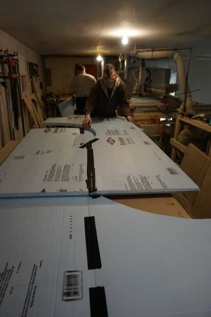 Con cinta las costuras de la hoja de la espuma con cinta adhesiva y dibujó los círculos con un marcador y una cadena, usando nuestro modelo de ordenador para obtener la medición correcta.