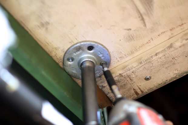 Atornillar las bridas de la tubería en una superficie.  La pared, o la plataforma por encima de su mesa de trabajo, o lo que funciona.
