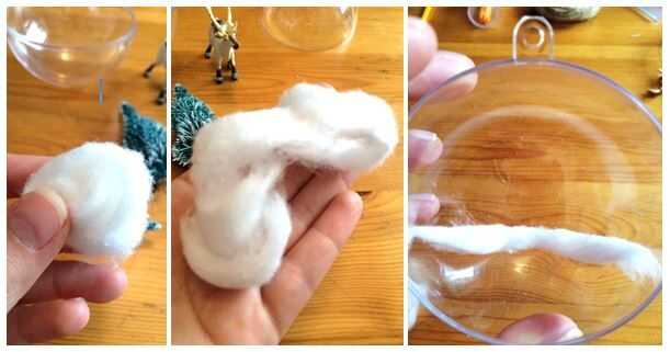 Tomar una bola de algodón y se extienden hacia fuera. Gire con cuidado un tercio de la bola en un cilindro largo. Colocar el algodón en la parte posterior de una mitad del globo. Esta se utilizará posteriormente para ocultar los troncos de los árboles y la caliente pegado utilizado para los árboles.