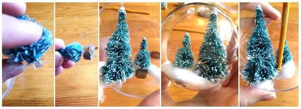 En la mitad mismo se colocan el algodón, pegamento caliente el medio árbol en Coloque y sostenga hasta que se asegure. No se olvide de pegar el derecho de árbol del mundo no el algodón. También, mantener el árbol alineado con el orificio del ojo en la parte superior del globo. Luego pegar el pequeño árbol en su lugar. Mantenga el algodón detrás de los árboles de ambos. La parte de atrás de un pincel, empuje con el algodón que cubre los troncos de los árboles y el pegamento. Una vez todo pegado en y algodón colocado, poner las piezas de dos mundo juntos para asegurarse de que los árboles y el algodón aún encaja y todavía se sientan donde usted planea que sean.