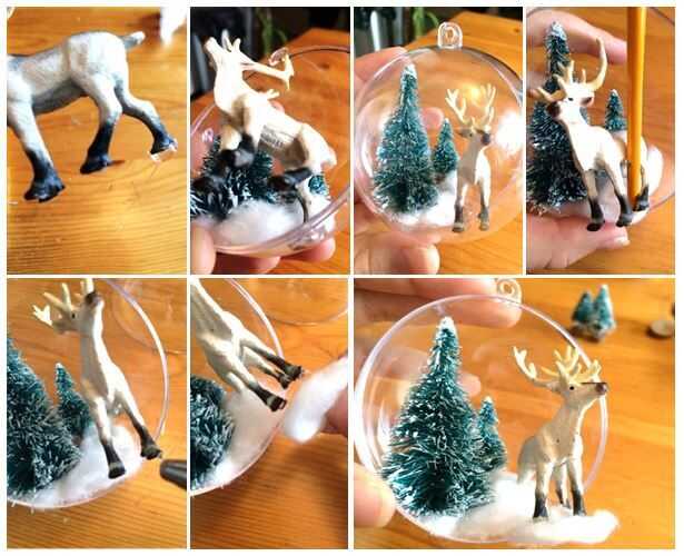En la misma mitad coloca los árboles, lugar caliente pegamento en la parte posterior del animal de pie y colocarlo directamente en la parte inferior del globo. Mantener en su lugar hasta que queden bien. Sólo necesitaba pegar un pie al globo para que el animal sea elevado. Otra vez Asegúrese de que su animal está de pie recto en relación con el orificio superior de los árboles y el mundo. Poner las dos mitades del mundo juntos para asegurarse de que todo encaja todavía. Usando la parte trasera del pincel agregar algodón más bajo el animal para ocultar el pegamento en su pie de atrás. Luego poner pegamento caliente en las dos patas delanteras del animal y colocar un copo de algodón para añadir un poco más plenitud a la escena.
