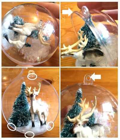 Muy cuidado, pegamento loco puede conseguir fácilmente en todas partes; especialmente en los dedos y luego en el mundo. Separar las dos mitades del globo sacudiendo toda la nieve falsa a la mitad. Encontrar la mitad donde la arboleda del guión es menor, este es el lado en que le pones el pegamento loco y así el lado debe tener todo la falsa nieve en. Tome la mitad y frote una pequeña cantidad de cola loca en la parte superior, (12:00) y los tres puntos en la parte inferior (4, 6 y 8:00). Ver foto para puntos específicos. Coloque la mitad no pegado junto con la mitad pegada, asegurándose de que reúnen los dos agujeros superiores.
