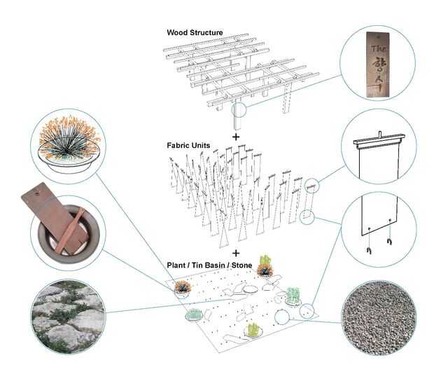 Este jardín tema "Nostalgia" consta de tres componentes principales: en la parte superior, una estructura de madera; en el medio, 42 muestras de la tela tradicional rotan en suspensiones prefabricadas; en la base, machacado piedra lavabos antiguos, tablas de lavar, rocas del río y especies de plantas con flores.