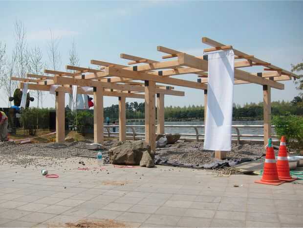Viguetas de madera y vigas de madera están conectados con los soportes de metal inclinados. perchas madera prefabricadas 42 se fijan a las vigas principales con un gradiente rotacional gradualmente cambiante.