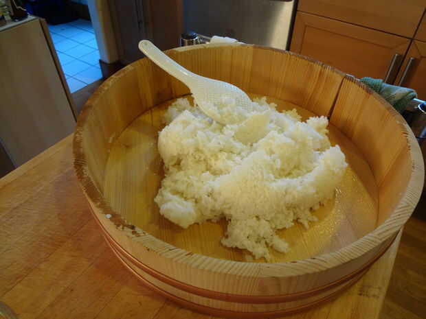 5. tener un ventilador auxiliar se enfría el arroz mientras se mezcla hasta que se absorba el vinagre y el arroz.