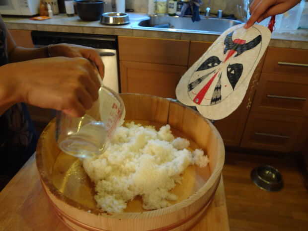3. Rocíe el vinagre de sushi sobre el arroz.