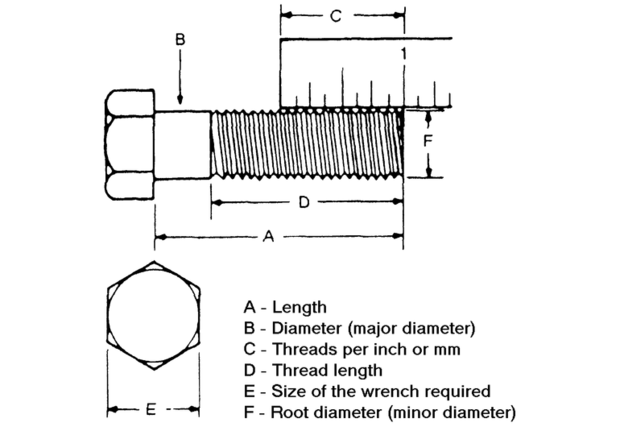 El tamaño de su perno y rosca será determinado por las longitudes de dar al A y B en la segunda imagen. Distancia se convertirá en el mayor diámetro de su perno. Distancia B es el diámetro menor. Estos son B y F respectivamente en la imagen de ejemplo he incluido 3.