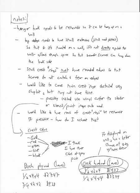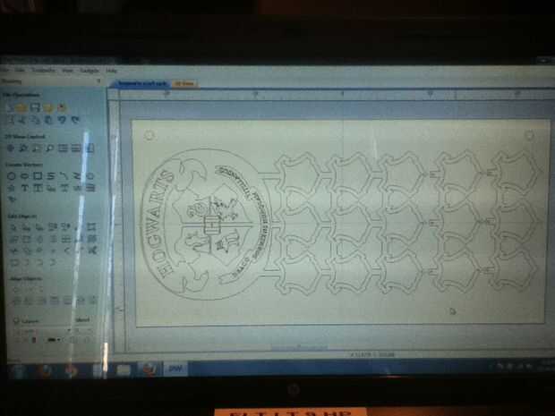 Lo siguiente que hice, una vez me decidí por una imagen a utilizar, fue importar la imagen a 3.5 coleccionables, tomar un contorno de la imagen, y luego un interior offset para crear una forma de "anillo" para las bufandas caber en a través de. Entonces copié esa imagen en una matriz de 5 filas y 3 columnas. Luego dibujé las líneas entre los "anillos" para conectarlos. Decidí que la imagen de la cresta principal, además de 5 filas permanentes de anillos"cresta" podrían ser demasiada altura para caber en un armario o en una pared. Así que decidí hacer las filas 4 y 5 extraíble. Lo hice por la perforación de agujeros en las piezas que conectan esas filas con las filas por encima de ellos y realizar la conexión con espigas de madera.