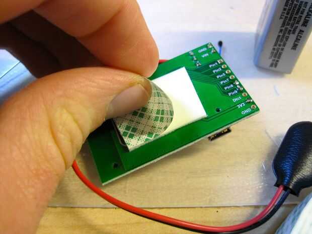 Para asegurar la batería a la placa breakout, un pequeño cuadrado de cinta de espuma hará el truco. Corte una pieza pequeña con un par de tijeras y pegue el lado adhesivo en la parte posterior de la placa breakout. Retire la película de soporte y pega la pila, asegúrese de mantenerlo agradable y cuadrados - este material es pegajoso! Una vez que tienes lo pegado en su lugar, seguir adelante y conectar la pinza de la batería.
