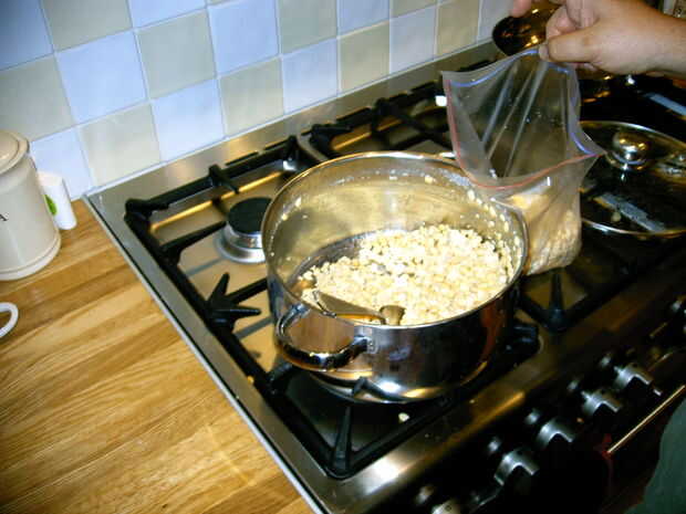 No queremos pegar los dedos en o cualquier cosa que no es muy limpia puede tener esporas de otros hongos en él y eso podría arruinar el tempeh. Me siento fuera de la olla.