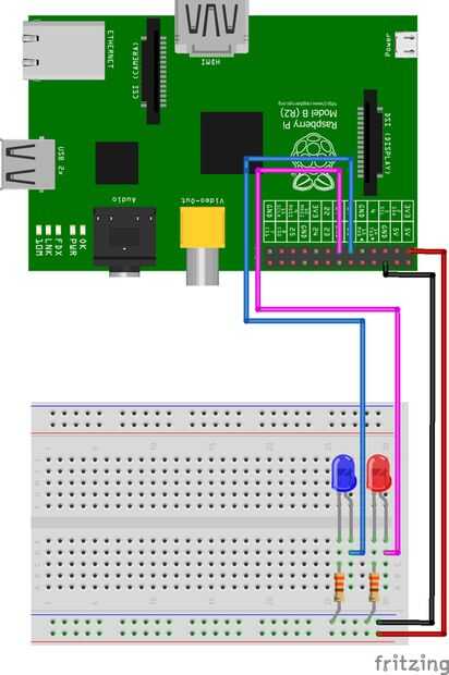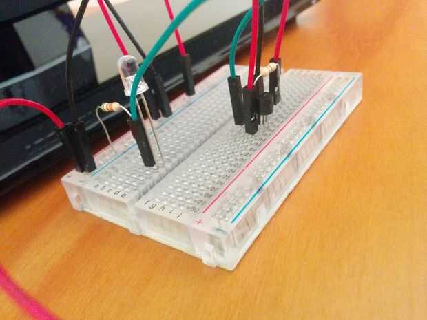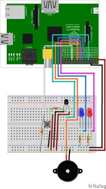 Inserte el cable de LED en la 17 GPIO en el Pi y el cable del termómetro en los 28 GPIO (si se usa el GPIO 28 se puede insertar en cualquier otro pin). Introduzca la tierra y los cables de alimentación en la placa y en la Pi (estos son el negro y el rojo en los esquemas). Y no olvide las resistencias, el LED de ambos y necesitan el termómetro.