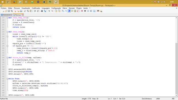 - bucle principal: Este es el corazón del programa, el LED se enciende, lee la temperatura, escribe la temperatura en un archivo y se apaga el LED. Entonces duerme durante 300 segundos (5 minutos) y repite el ciclo para siempre.