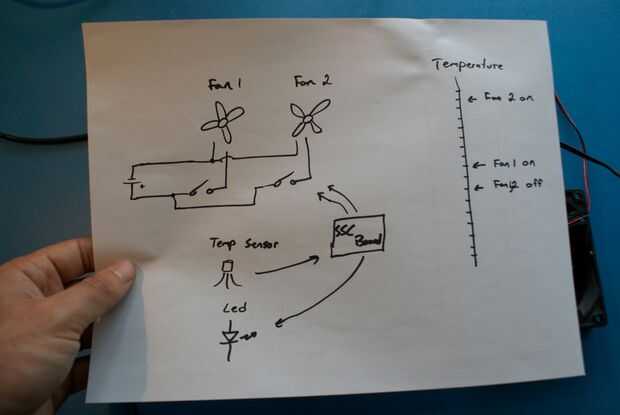 Vamos a tener el LED parpadea en sobre y en un segundo intervalos (0.5 Hz). Ventilador 1 se encenderá en 46C de temperatura. Ventilador 2 se encenderá a temperatura de 60C. Para tener cierta histéresis ambos ventiladores se apagará a temperatura de 30C.