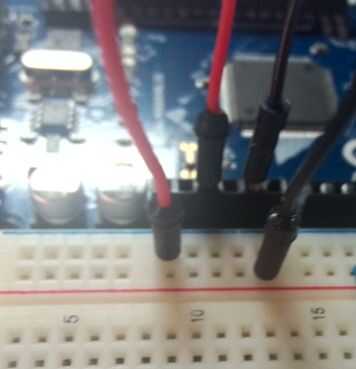 Enchufe + fuente de alimentación 5V y GND a la Junta de pan de la Junta de desarrollo de MEGA ICSTATION y el cable rojo del pan se utiliza como línea de alimentación, el negro uno como línea de tierra.
