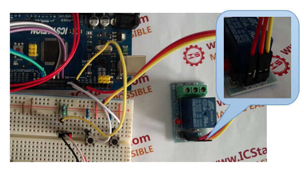 El relé de VCC y GND respectivamente conectan a la tarjeta del pan "+" "-" y conecte con el conector de la placa de desarrollo 13.