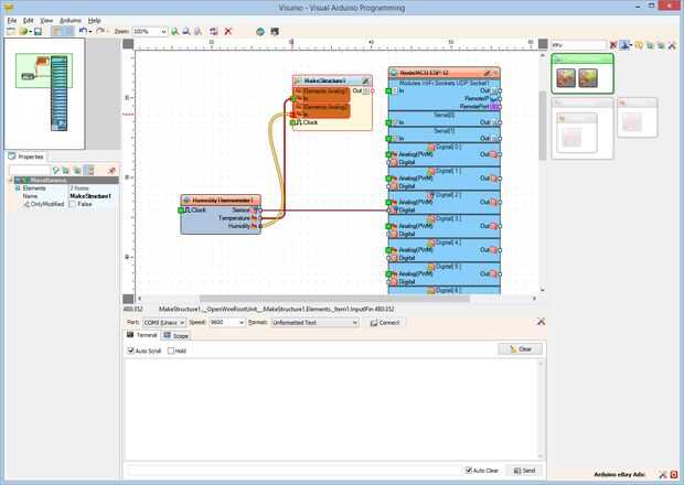 3. Conectar la clavija "a" del componente MakeStructure1 en el pin "en" de la "Modules.WiFi.Sockets.UDPSocket1" del componente "NodeMCU ESP-12" (imagen 3)