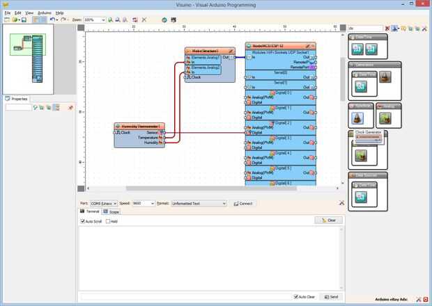 El proyecto puede utilizarse como es, pero si lo ejecuta abrumará la red con paquetes UDP, como va seguir enviándonos las lecturas del termómetro muy rápido uno tras otro. Es mejor leer el termómetro sólo una vez por segundo. El componente de termómetro tiene un pin de "Reloj", que puede utilizarse para controlar cuando el termómetro realiza una lectura y enviar el valor a la toma de corriente. Utilizaremos un componente generador de reloj para controlar el termómetro.