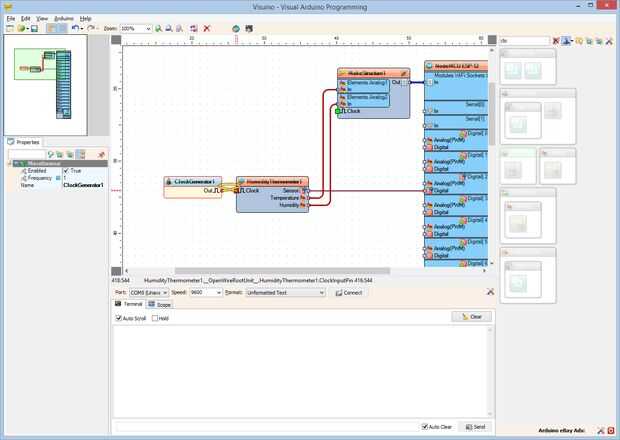- Conectar la clavija "a" del componente ClockGenerator1 en la clavija de entrada de "Clock" del componente HumidityThermometer1 (foto 2)