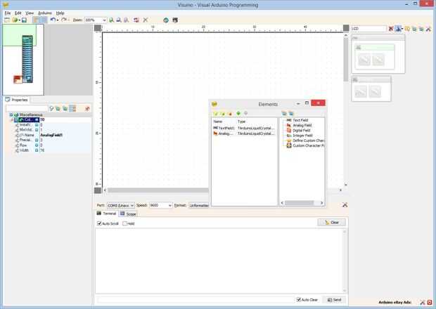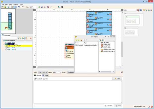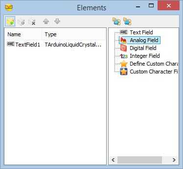 3. Añadir campo analógico para el valor de la temperatura por seleccionar el "Campo analógico" en la ventana derecha del editor de "elementos" y haciendo clic en el "+" botón (imagen 5)