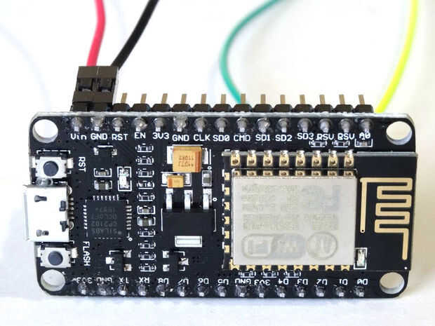 5. Conecte el otro extremo del cable(cable rojo) con el conector de energía de 5V(llamado "Vin" en la versión 1.0) de la Junta de ESP8266 NodeMCU(foto 3)