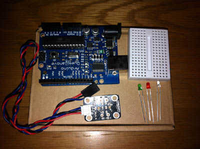 Arduino Sensor de temperatura LM35 3 LEDs (rojo 1 x, 1 x amarillo, 1 x verde) plomo y batería de 9v Protoboard pequeño y los cables generalmente Caja de cartón pequeña