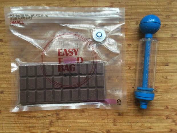 Vacío empacar el chocolate en la bolsa a través de bomba de mano (se muestra) o si tienes un embalador del vacío que idea, no te preocupes de conseguir demasiado apretado como cambiará la forma una vez derretido.