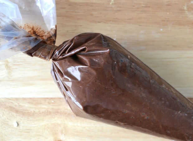 Gire la bolsa en la parte posterior así que es muy apretada y hay presión empujando el chocolate hacia fuera el extremo de la boquilla.