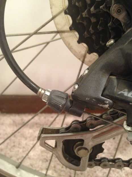 No tire del cable a una tensión moderada. Tirar demasiado apretada hará que el desviador para que no tenga una gama completa de movimiento y no causará el desplazamiento ser muy lento o no funciona en absoluto. Mientras sostiene el cable en tensión moderada apriete el perno que se sujete el cable. Nota: Asegúrese de no para apretar demasiado el tornillo o el cable puede empezar a fray o incluso la rotura.