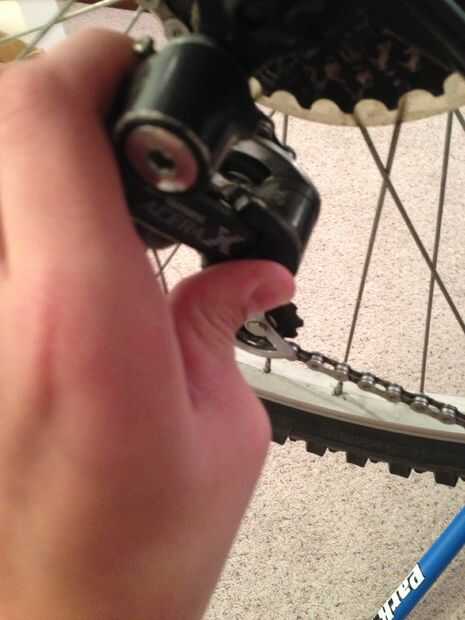 Gire el tornillo del límite alto para evitar que la cadena saltando por encima de la parte superior de la cadena. Asegúrese de que la cadena todavía alcance el anillo de la cadena. Para probar, empuje el cambio mientras pedalea para mover la cadena por mano. (imagen 3)