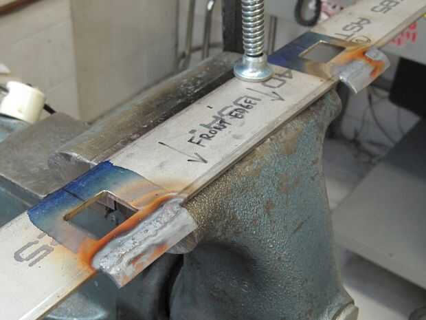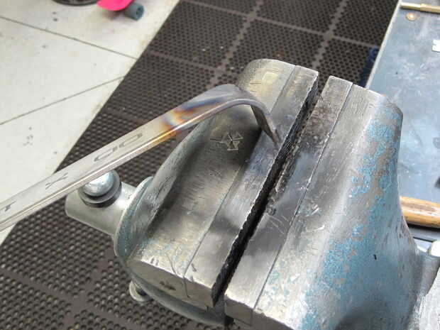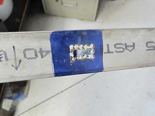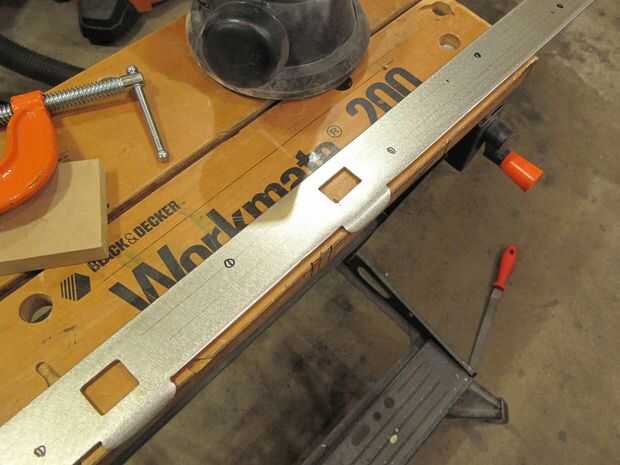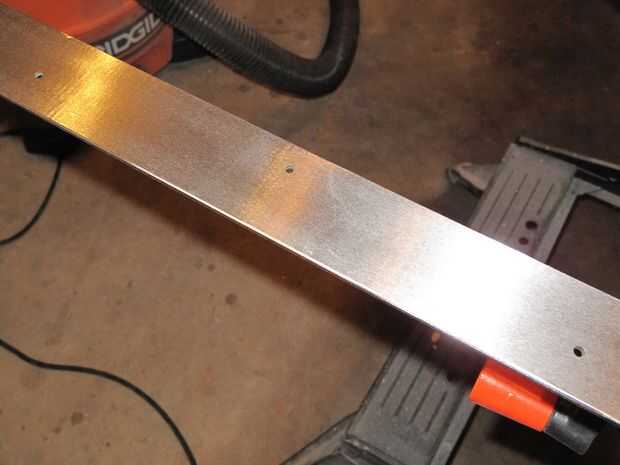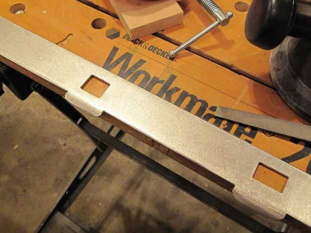 En este punto, las rampas de captura se viraron en su lugar, ajustada para asegurarse de que estaban alineados y soldado con autógena en. Una vez haya enfriado la pieza (no sacian el metal porque no quería tener una oportunidad en el lo endurecimiento) solía un archivo y una amoladora angular liso abajo las soldaduras y dar cierta forma a los bordes de las rampas de la captura. Una vez todo liso, lija la superficie con una lijadora orbital para unificar la textura de la superficie y suavizar cualquier dips. He marcado dos líneas abajo de la tira - el primer 1/2" desde el borde trasero, el segundo 1-1/8" desde el borde trasero. Luego marqué la posición de los tornillos sobre cada 6" en las líneas de alternadas a lo largo de la longitud de la tira. Los orificios deben estar alternando para que evitar la creación de una línea de tensión (que pueda causar una división) en la madera que voy anclar a.