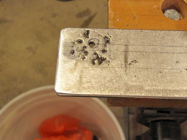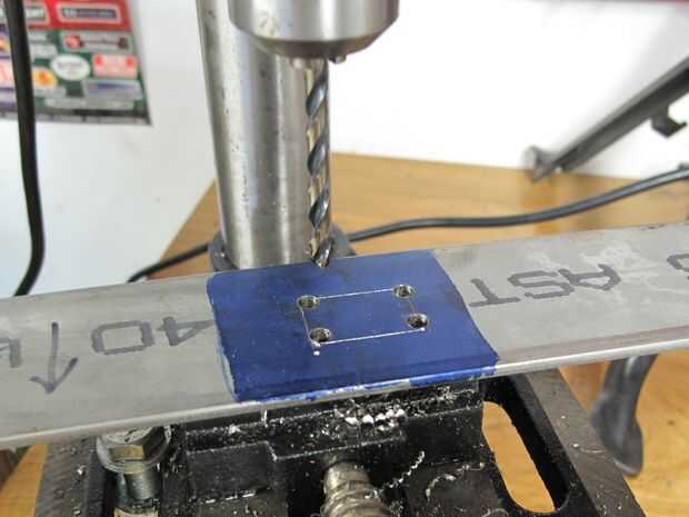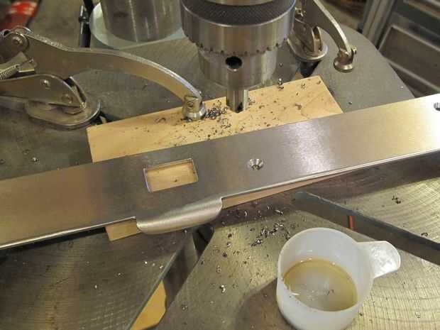 Taladrar y avellanar los orificios son autoexplicativa - pero un buen consejo es usar aceite de corte al hacerlo. El acero es mucho más fácil taladrar y trabajar con aceite de corte - las brocas se cortan más rápido, más limpio, más frescas y seguir fuertes. Generalmente tengo una bola de plástico pequeña donde pongo aproximadamente media cucharadita de aceite y sumerja el taladro del pedacito dos o tres veces durante el proceso de perforación/avellanado. Esto parece mucho más limpia y menos derrochador de goteo de aceite en la superficie y tener 90% de los terminan en el lugar equivocado.