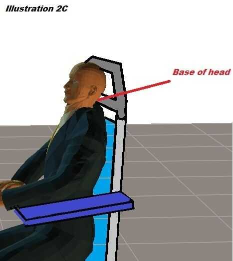 La parte recta de PVC 1 debe ser a la altura de la base de la cabeza de la persona que si la persona en silla de ruedas cayó hacia atrás, el tubo amortigua la cabeza justo por encima del cuello como se muestra en la ilustración 2C. El tubo de PVC recto 2 debe colocarse justo debajo de la parte superior de la cabeza de las personas para que el individuo puede descansar su cabeza cómodamente a ambos tubos diagonales cuando ponen detrás. La longitud de 4, 11, 15 y 16 determinan la ubicación de donde la cabeza de individuos reposará sobre estos tubos y se debe ajustar según altura del individuo.