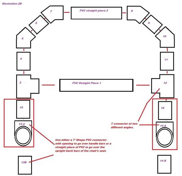 Ilustración 2B establece cómo se montará los conectores y tubos de PVC. Antes de cortar las piezas, usted deberá determinar las medidas exactas para cada una de las piezas rectas de tubería de PVC. Como cada modelo de silla de ruedas tiene sus propias especificaciones, deberás medir cuidadosamente el respaldo de la silla de ruedas. La longitud del respaldo va a determinar cuánto tiempo el tubo recto de PVC numerados 1 y 2. Una vez conectado, las partes 13 y 14 A o B tendrá que se alinean perfectamente con las barras verticales del respaldo o el manillar de sillas. Por esta razón, es una buena idea para medir varias veces para asegurar un ajuste exacto.