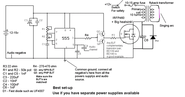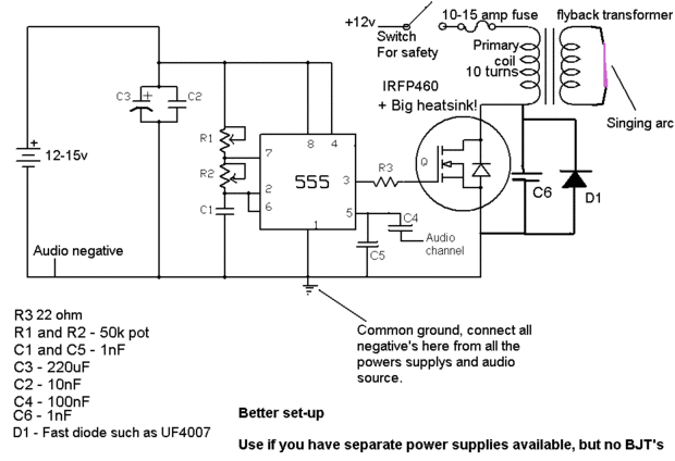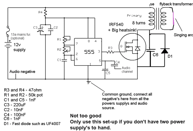 No recomiendo el tercer esquema que utiliza la misma fuente de alimentación para el temporizador 555 y el flyback y esto puede causar problemas.