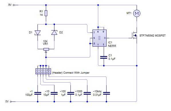 Este circuito utiliza el temporizador 555 común para crear y variar la señal PWM. El circuito utiliza un potenciómetro para variar la señal de PWM de salida de alrededor de 5% a 95% de la potencia suministrada y un puente utiliza para variar la frecuencia de alrededor de 1hz a 10khz. El puente se utiliza para conectar el potenciómetro a un capacitor diferente que cambia la frecuencia de la señal PWM. El cambio de frecuencia está marcado al lado de cada condensador y muestra cómo se de que múltiplos de 10 como se mueve el puente izquierda a derecha.