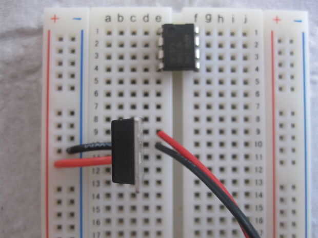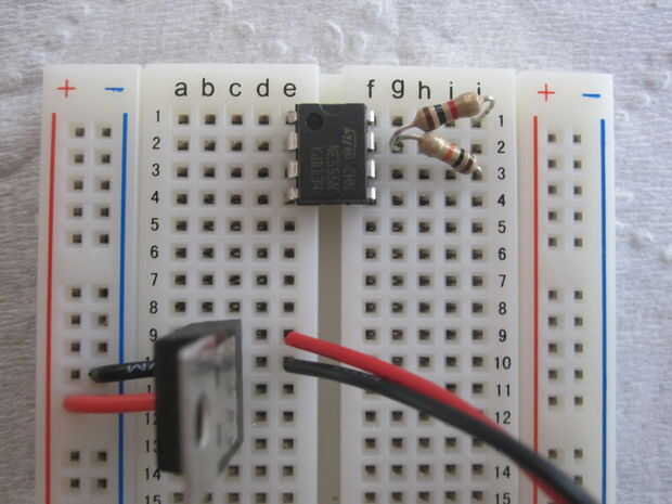 Ahora añadir los primeros componentes. Siga las imágenes. Estamos poniendo el temporizador, clip de batería, regulador de voltaje y algunos pequeños puentes para hacerlo.
