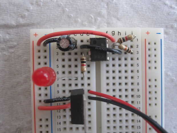 También agregamos un pequeño puente conexión gnd del condensador para el carril de tierra. Eso es él-así que usted puede conectarse una batería de 9v y verá el inicio LED parpadeando. Si realmente lentamente está parpadeando, reemplace la tapa con una tapa más pequeña. Si está parpadeando para ayunar, reemplace la tapa con uno un poco más grande. (Yo usé 100uF)