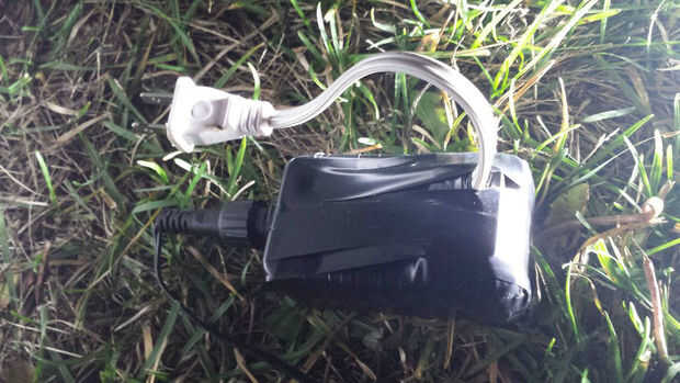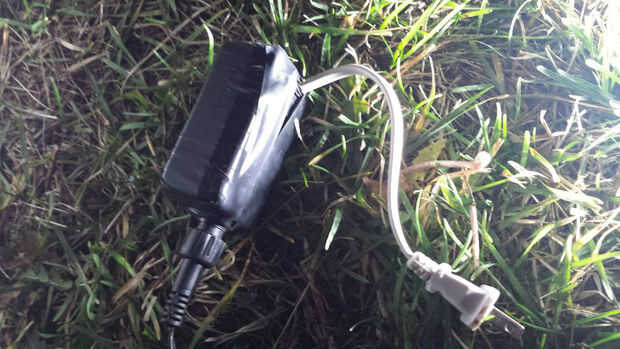 Usé un enchufe de un ventilador oscilante roto, soldado a los restos de los terminales de enchufe en el adaptador, luego envuelve el ladrillo con cinta aislante y esperaba que mantendría a la lluvia. La solución llevó a cabo y todavía funciona un año más tarde. Compré 12 pulgadas tienda estacas para mantener y no han tenido un problema con el viento desde.