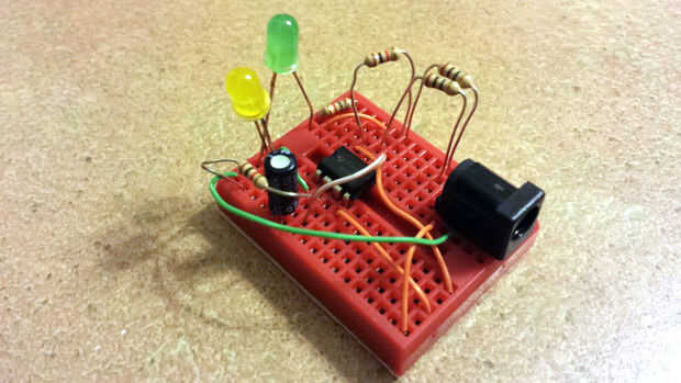 Puesto que el circuito original se hizo con los dispositivos de montaje superficial (SMD), y todo estaba reemplazando con dispositivos a través del agujero, tuve que simplificar la sustitución un poco para asegurarse de que todavía cabe en el soporte de 52mm. El circuito original tenía algún tipo de microcontrolador, que deseaba cambiar entre varios patrones diferentes pero decidí que solo necesitaba 2 Estados de los LEDs, tenues y brillantes. Tomé un circuito 555 temporizador de este sitio y había modificado un poco.