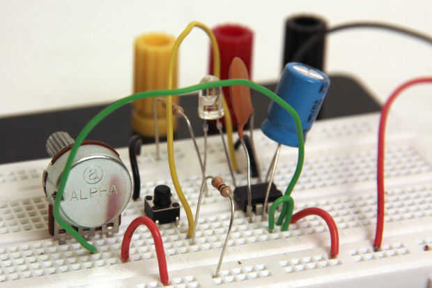 I había cableado 10Kohmpotenciómetro como una resistencia variable y ponerlo en mi circuito en lugar del resistor de 10 K entre 555 pines 7 y 8 (Fig. 9). Esta forma girando hacia un lado, el LED permanece durante 5,17 segundos, pero cuando se volvió hacia el otro extremo el LED se apaga inmediatamente después de el botón. Girando el potenciómetro a cualquier posición en el medio hará una duración del pulso en cualquier parte de 0 a 5,17 segundos.