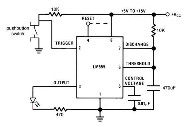 Conecte el interruptor de botón momentáneo en serie con un resistor de 10K entre Vcc y tierra. Conecte un cable (amarillo) de la ensambladura entre el interruptor y la resistencia al pin de disparo para que cuando no se presiona el interruptor el pasador del gatillo se mantiene alta. Cuando el interruptor se presiona el perno gatillo bajará a baja. Ver el esquema, si esto no tiene sentido.